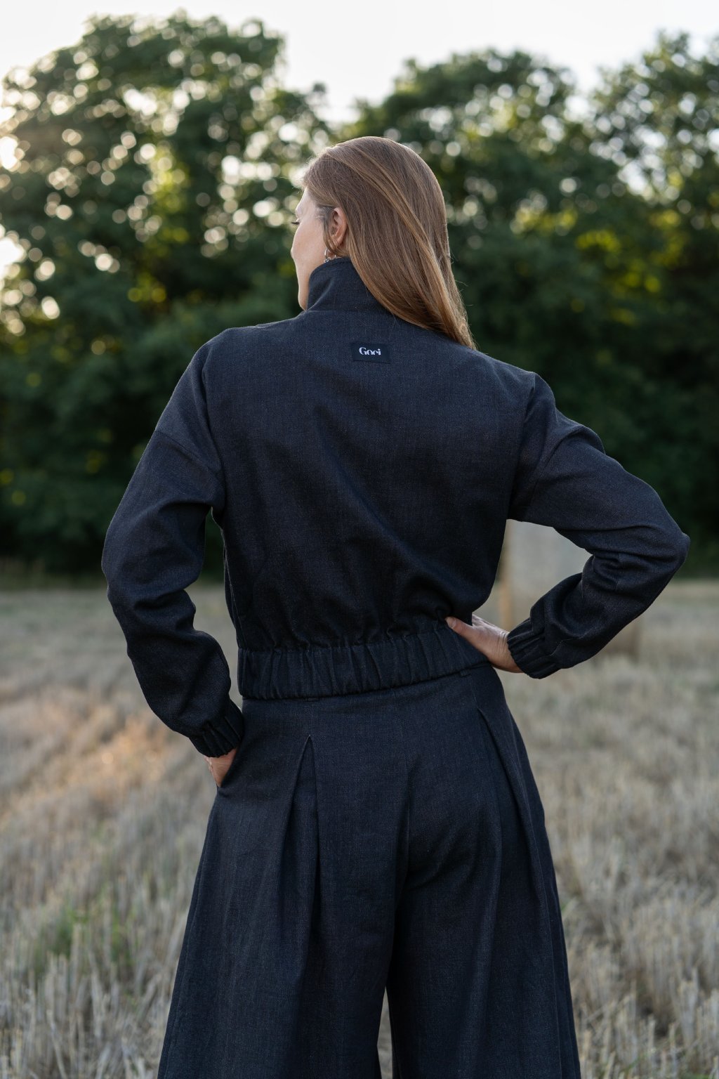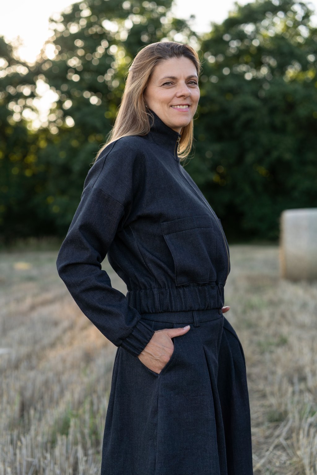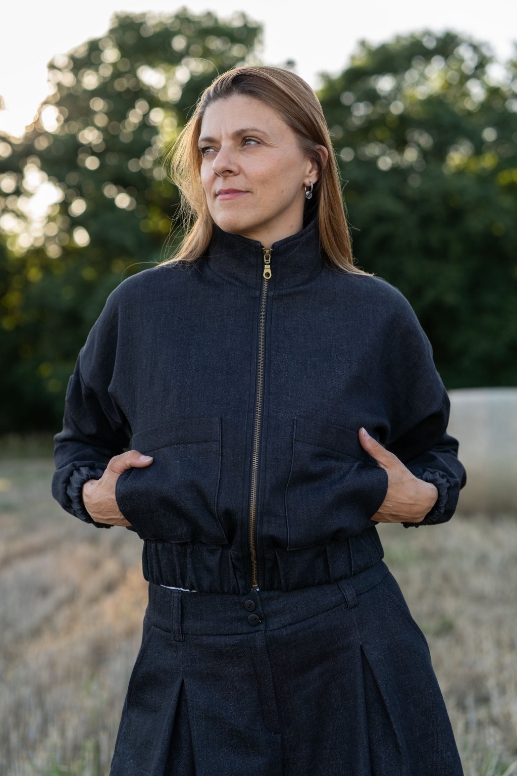 Bomber je ušitý z pružné rifloviny, která zajišťuje komfortní pohyb po celý den. Guma v pase se postará nejen o pohodlné nošení, ale také opticky zúží pas. Originální provedení kapes navíc vzniklo na vaše přání. Skvěle se hodí ke kalhotové sukni.