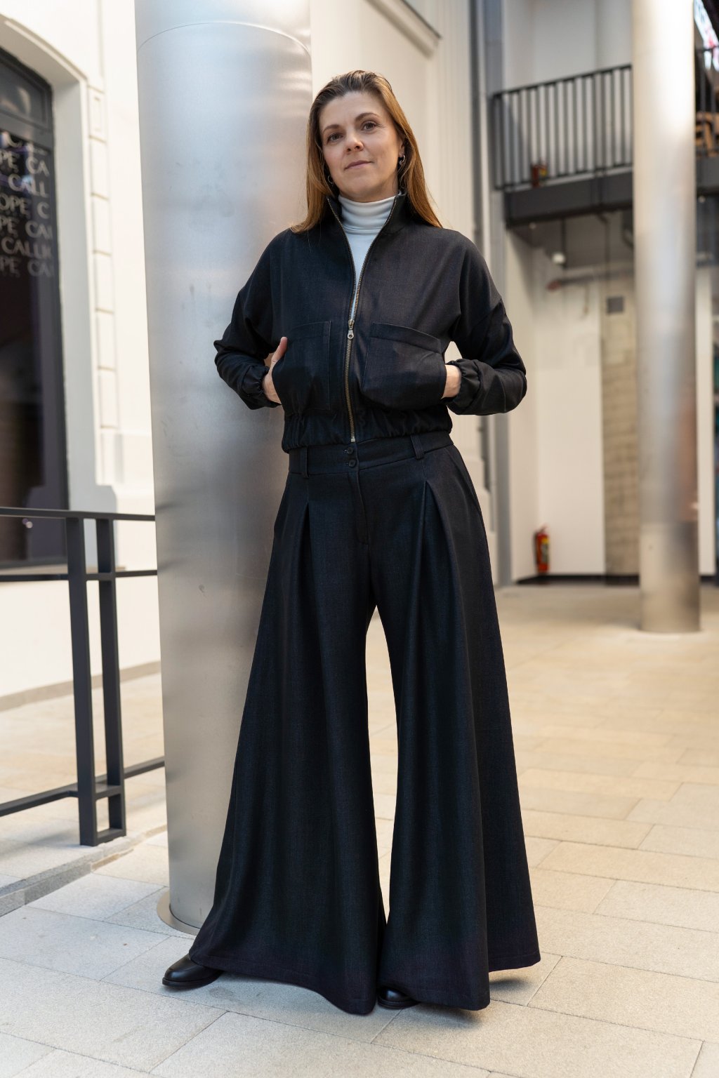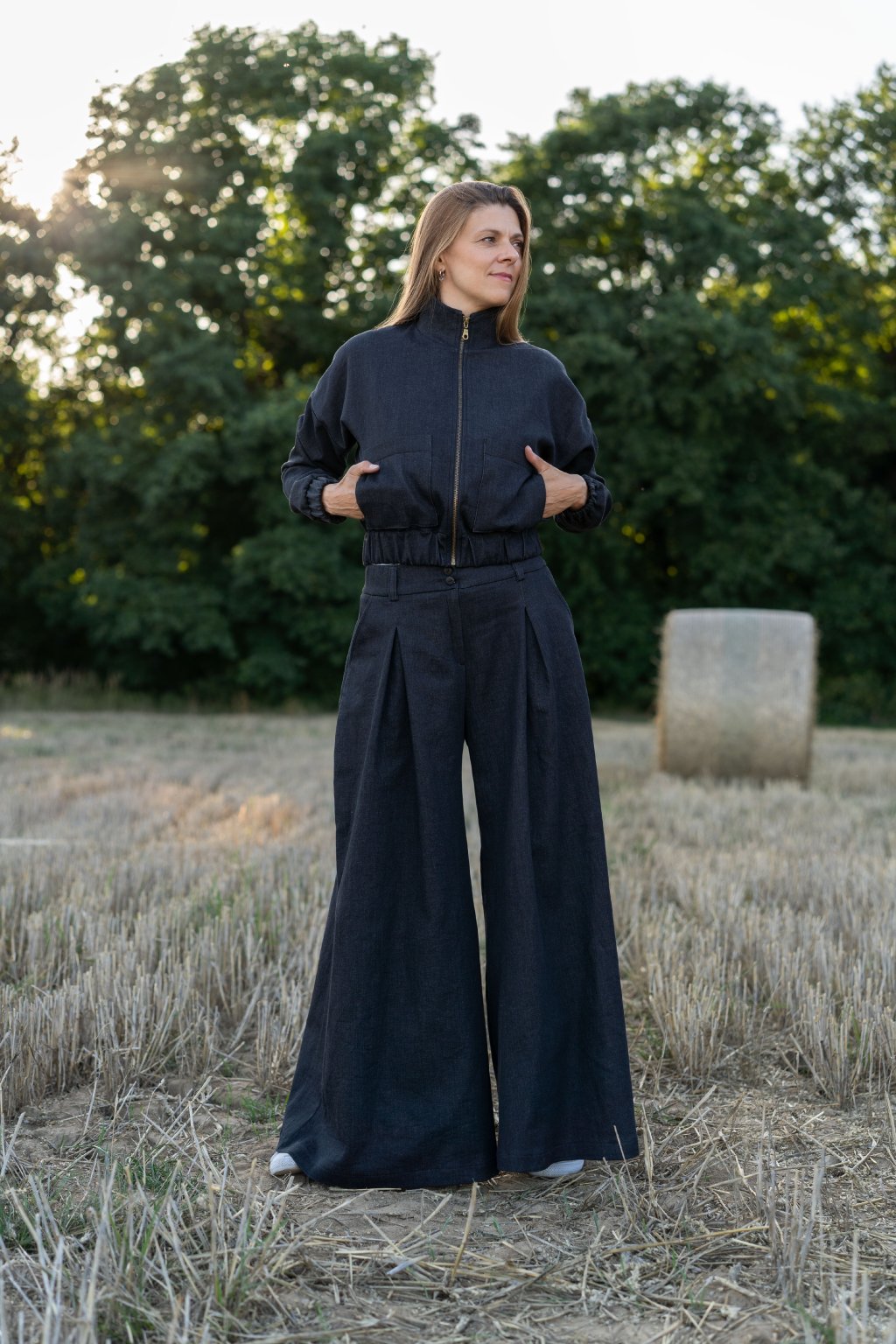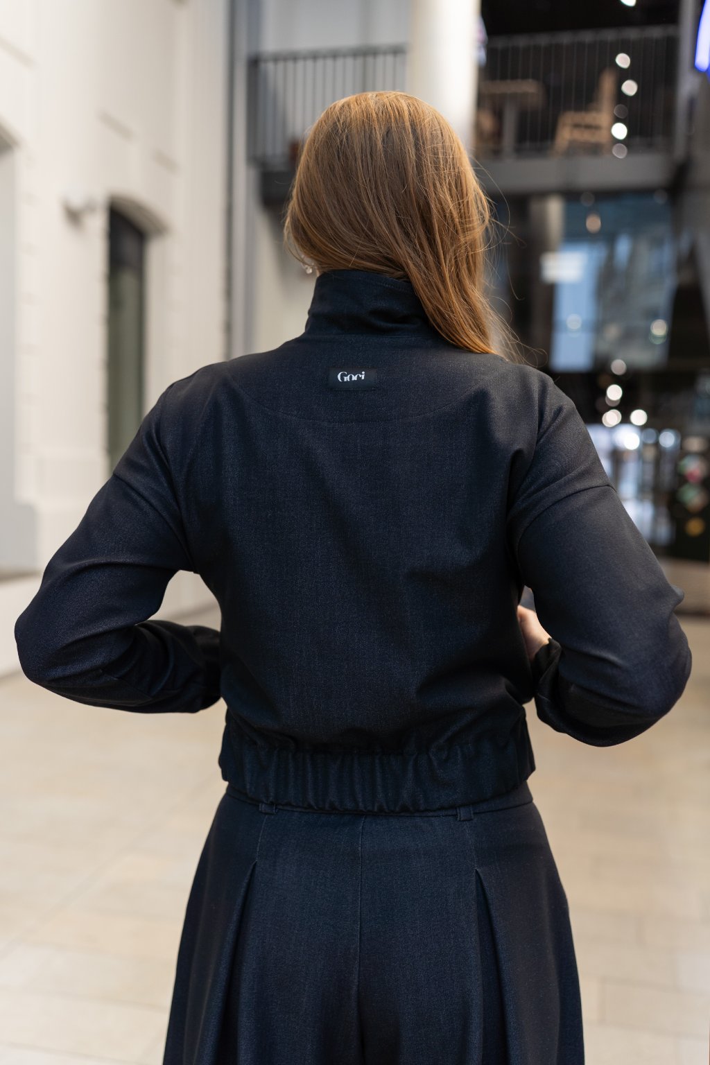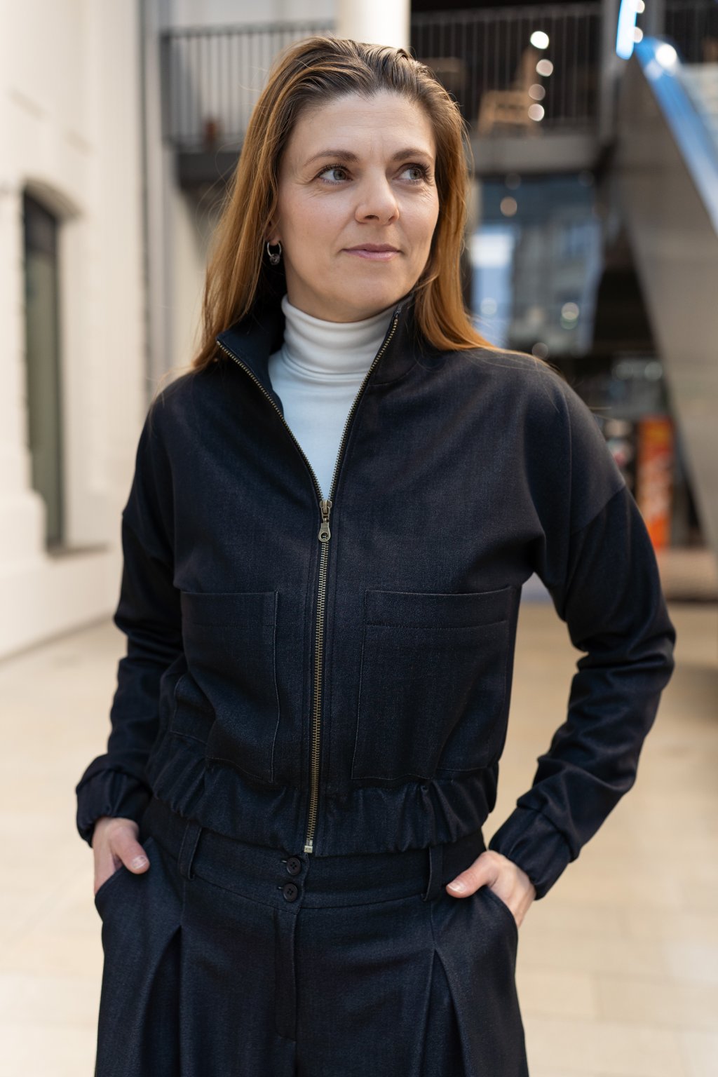Bomber je ušitý z pružné rifloviny, která zajišťuje komfortní pohyb po celý den. Guma v pase se postará nejen o pohodlné nošení, ale také opticky zúží pas. Originální provedení kapes navíc vzniklo na vaše přání. Skvěle se hodí ke kalhotové sukni.