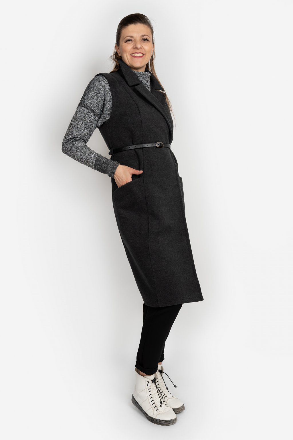 Klopa, pásek, délka pod kolena, hluboké kapsy a hřejivý flaušový materiál tvoří jedinečnou kombinaci. Zapínání vesty je řešeno pomocí patentů. Obléknout ji můžete k šatům, ke kalhotám, na sako či roláček. Vytvoříte s ní mnoho originálních módních variací.