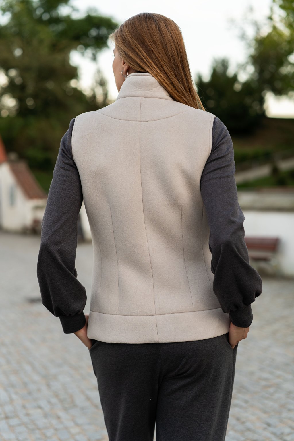 Vesta je ušitá z oděvního neoprenu a její vypasovaný střih lichotí postavě. Přední díl zdobí lištové kapsy s patkou, kterou lze efektně schovat uvnitř kapsy. Jistě oceníte i stříbrný zip, který dodá vestě eleganci i praktičnost. Lze ji snadno kombinovat a vytvořit tak outfit přesně podle vlastních představ.