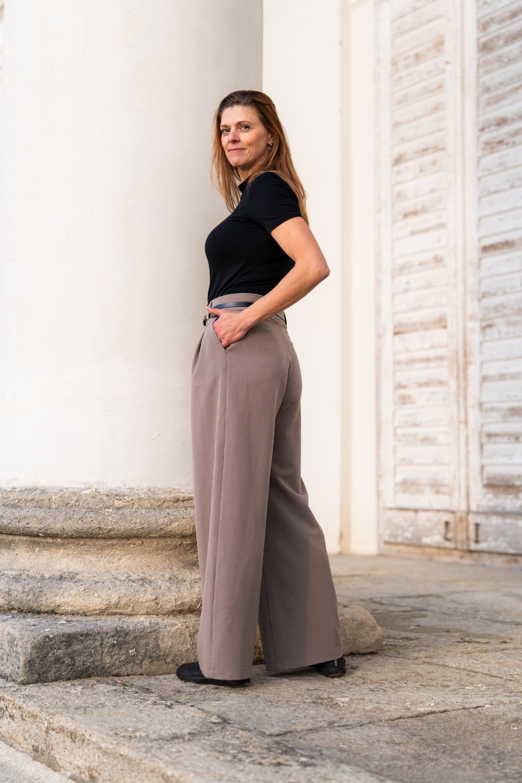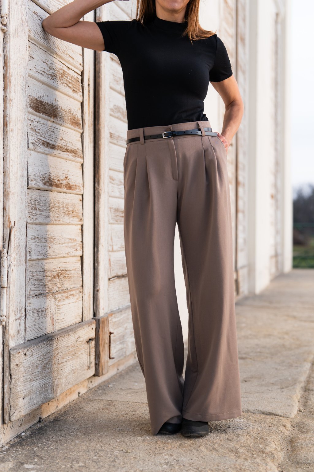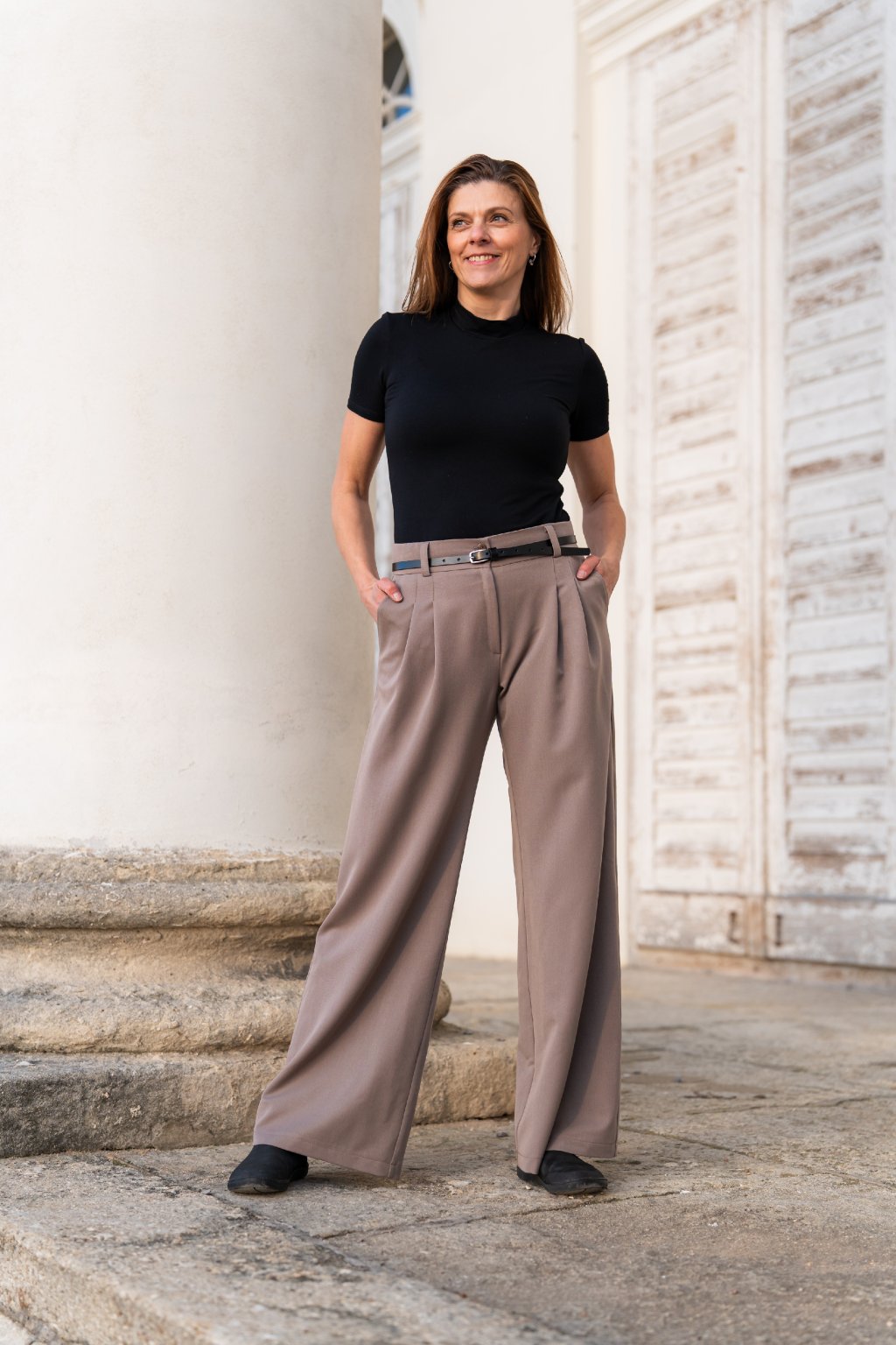 Nadčasové široké kalhoty se záhyby opticky prodlouží nohy a dodají vašemu outfitu šmrnc, ať jste v kanceláři, na schůzce s kamarádkou nebo na večeři ve městě. Široká guma v pase se postará o celodenní pohodlí, aniž by vás kalhoty omezovaly v pohybu. Kalhoty jsou ušity z kvalitní splývavé viskózové směsi, která působí luxusně a příjemně se nosí po celý den. Snadno je zkombinujete s jednoduchým tričkem, košilí i sakem – stanou se univerzálním kouskem šatníku, po kterém sáhnete vždy, když chcete vypadat upraveně a cítit se pohodlně.