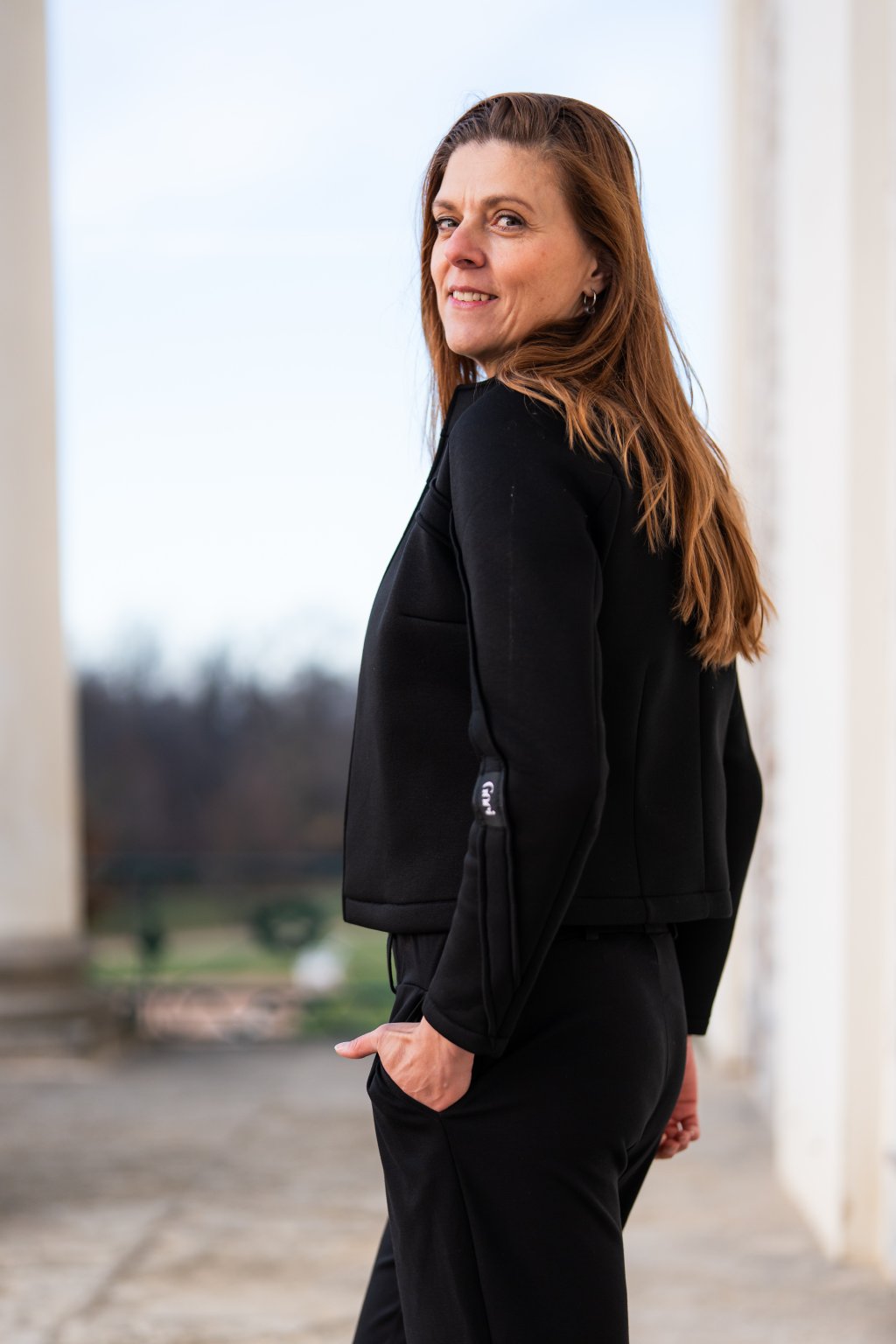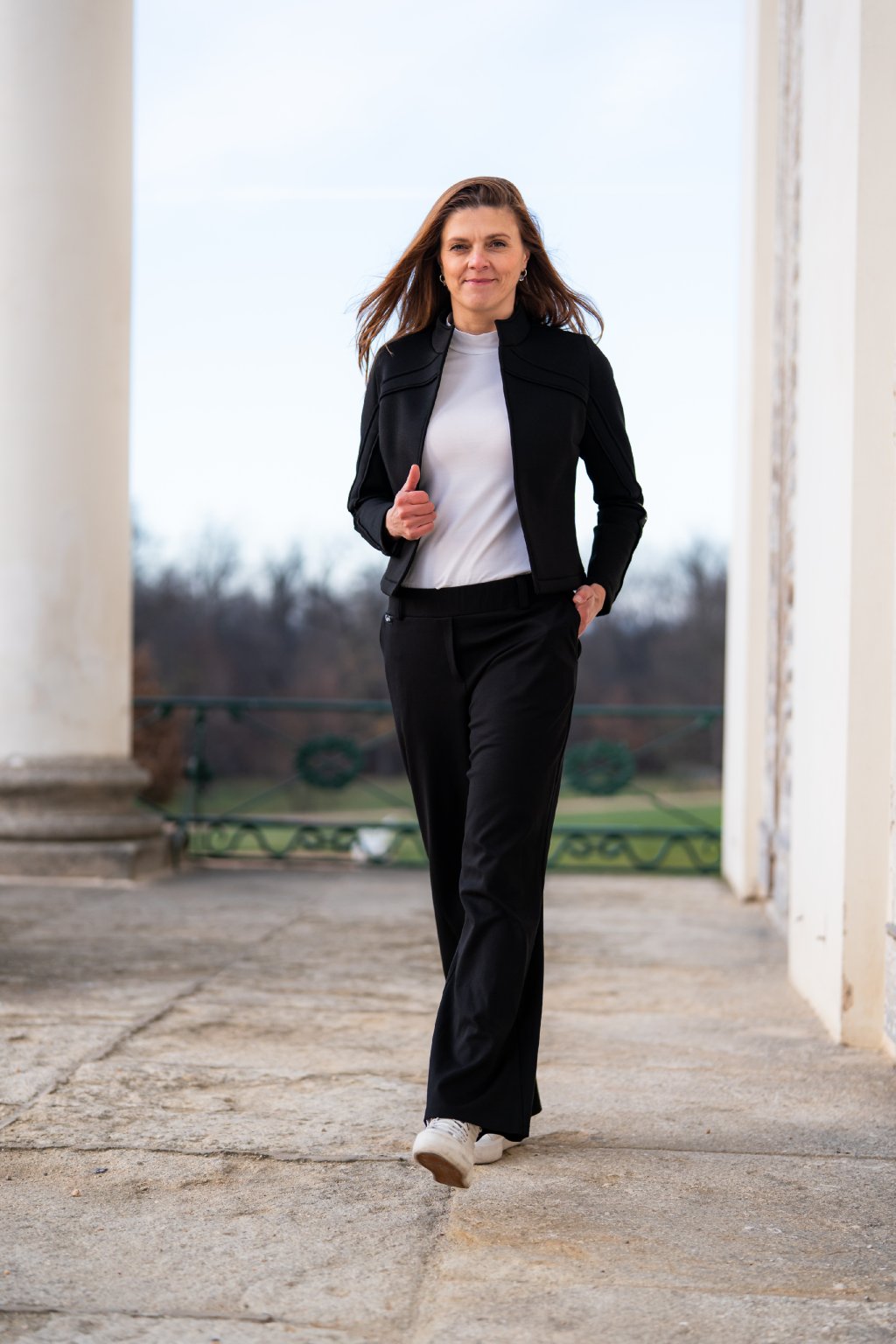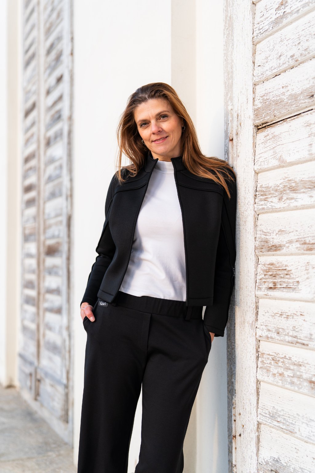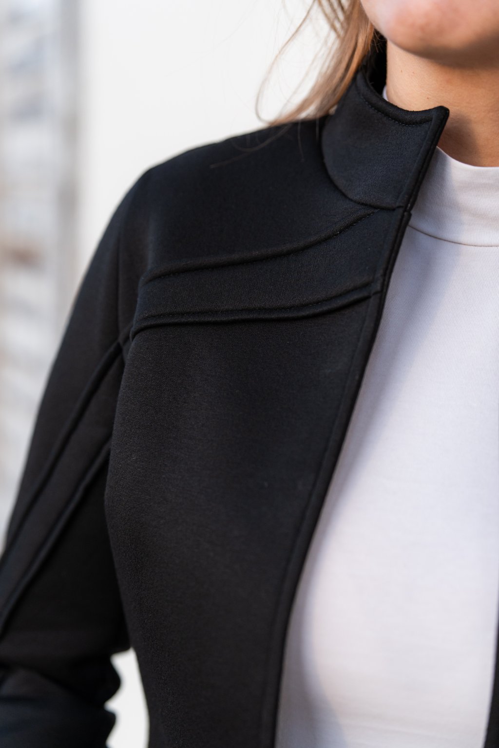 Krátká bundička sportovně‑elegantního střihu, která se nezapíná a dodá outfitu mladistvý výraz. Přední díl i rukávy jsou ozvláštněny našitými detaily, díky kterým bunda vyniká i v jednoduché kombinaci s tričkem a kalhotami Styl.
