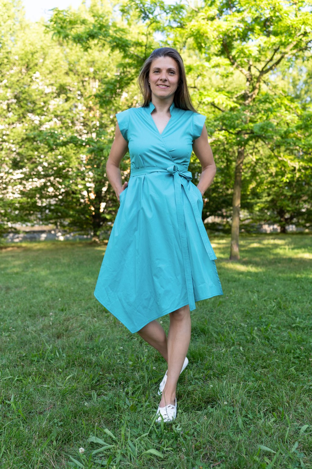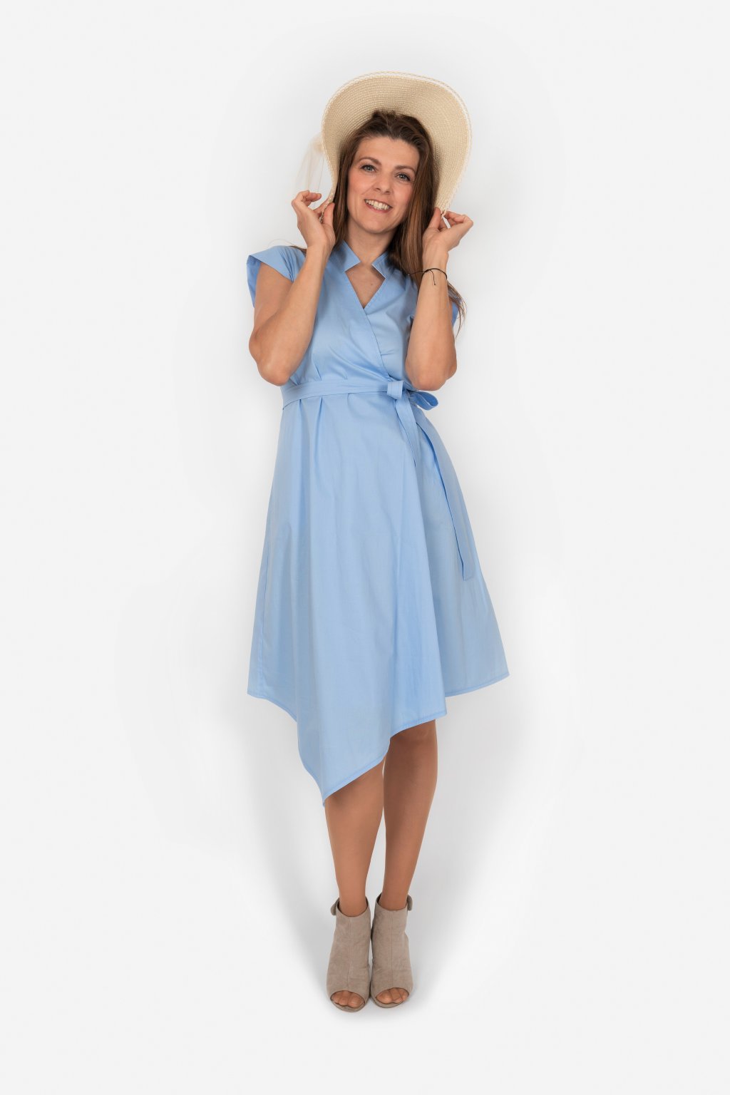 Letní šaty ze směsi bavlny a elastanu jejichž originální střih podtrhne ženskost každé postavy. Šaty mají malý stojací límeček a výstřih do tvaru V. Přední díl je střižen do cípu a je delší než zadní díl. Největší předností těchto šatů je, že to jsou zavinovačky, které si můžete "utáhnout" podle vlastní potřeby. A i když působí elegantně, nechybí jim kapsy na drobnosti.