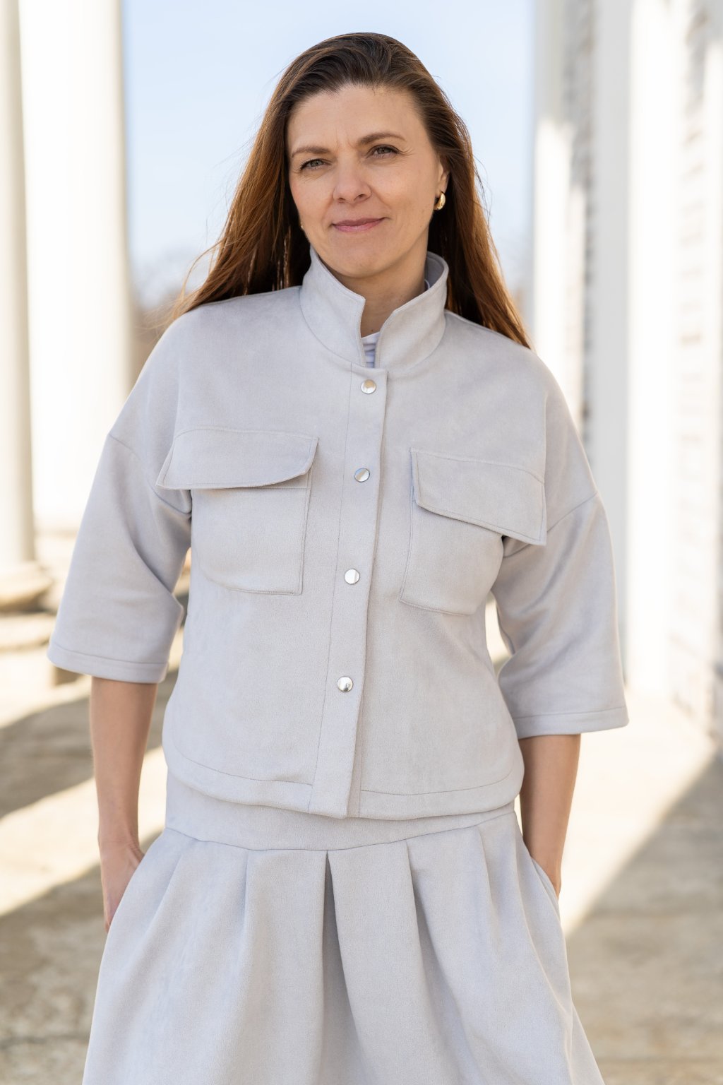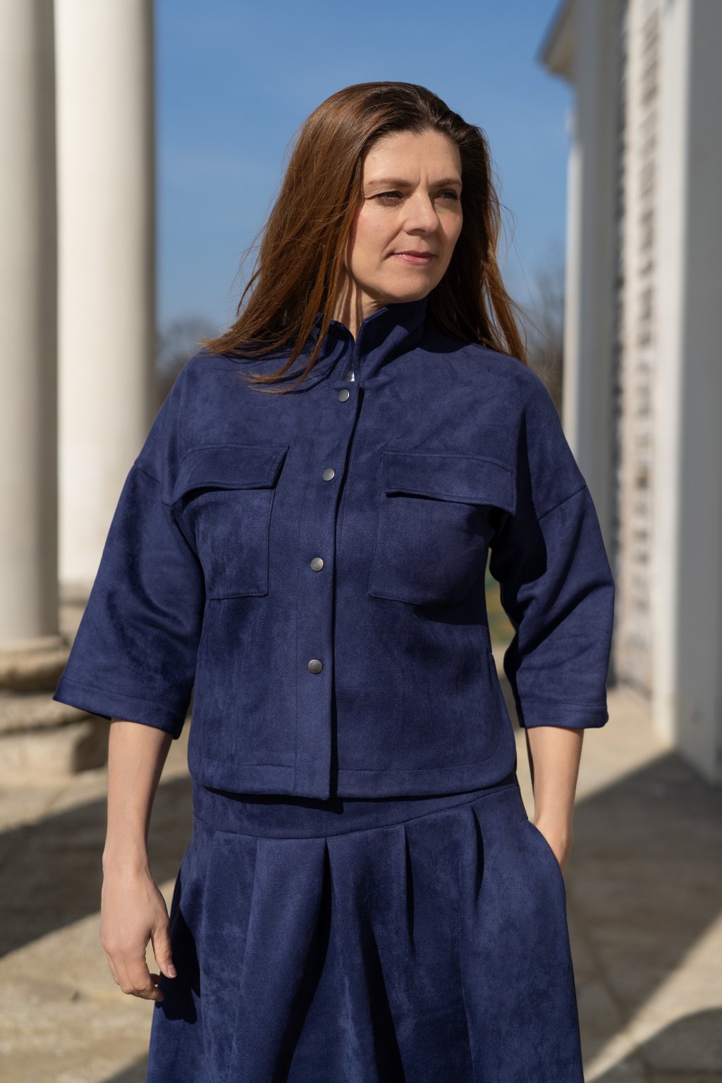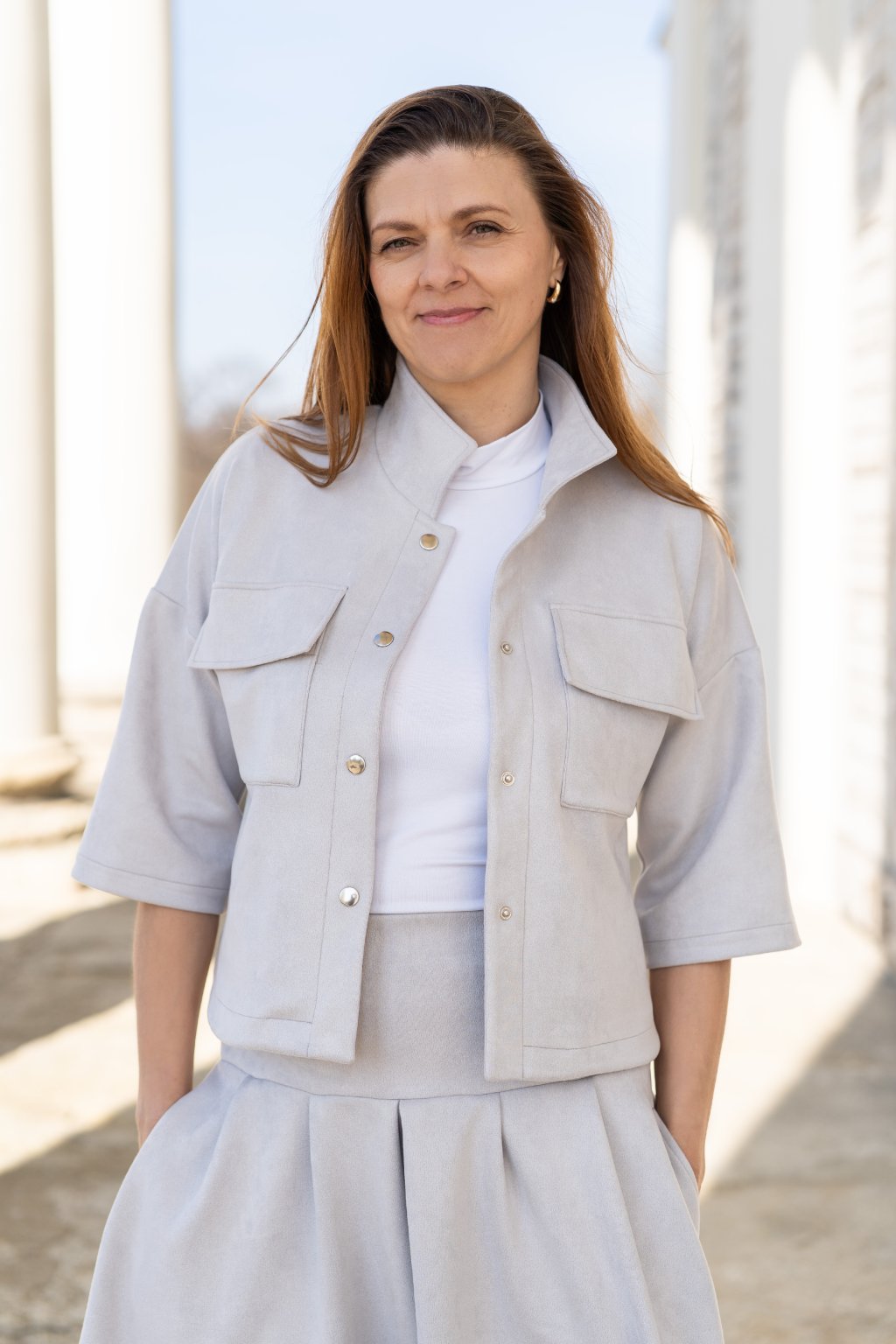 Lehká jarní bundička zapínaná na patenty, která spojuje pohodlí a styl. Je ušitá z pružného, jemně počesaného materiálu, který je mimořádně příjemný na dotek a zajišťuje maximální komfort při nošení. Volnější střih inspirovaný košilí působí ležérně a moderně, zatímco kulaté rozparky na bocích dodávají modelu originální šmrnc. Bundičku snadno zkombinujete s kalhotami i sukní, a vytvoříte tak outfit pro každou příležitost.