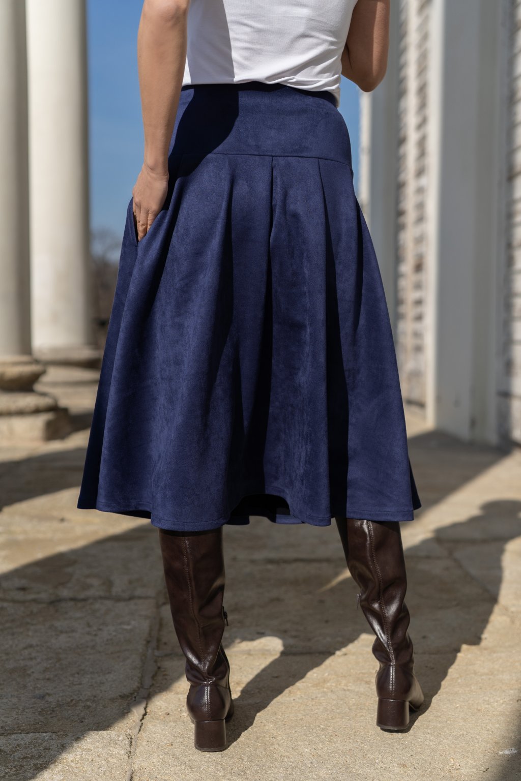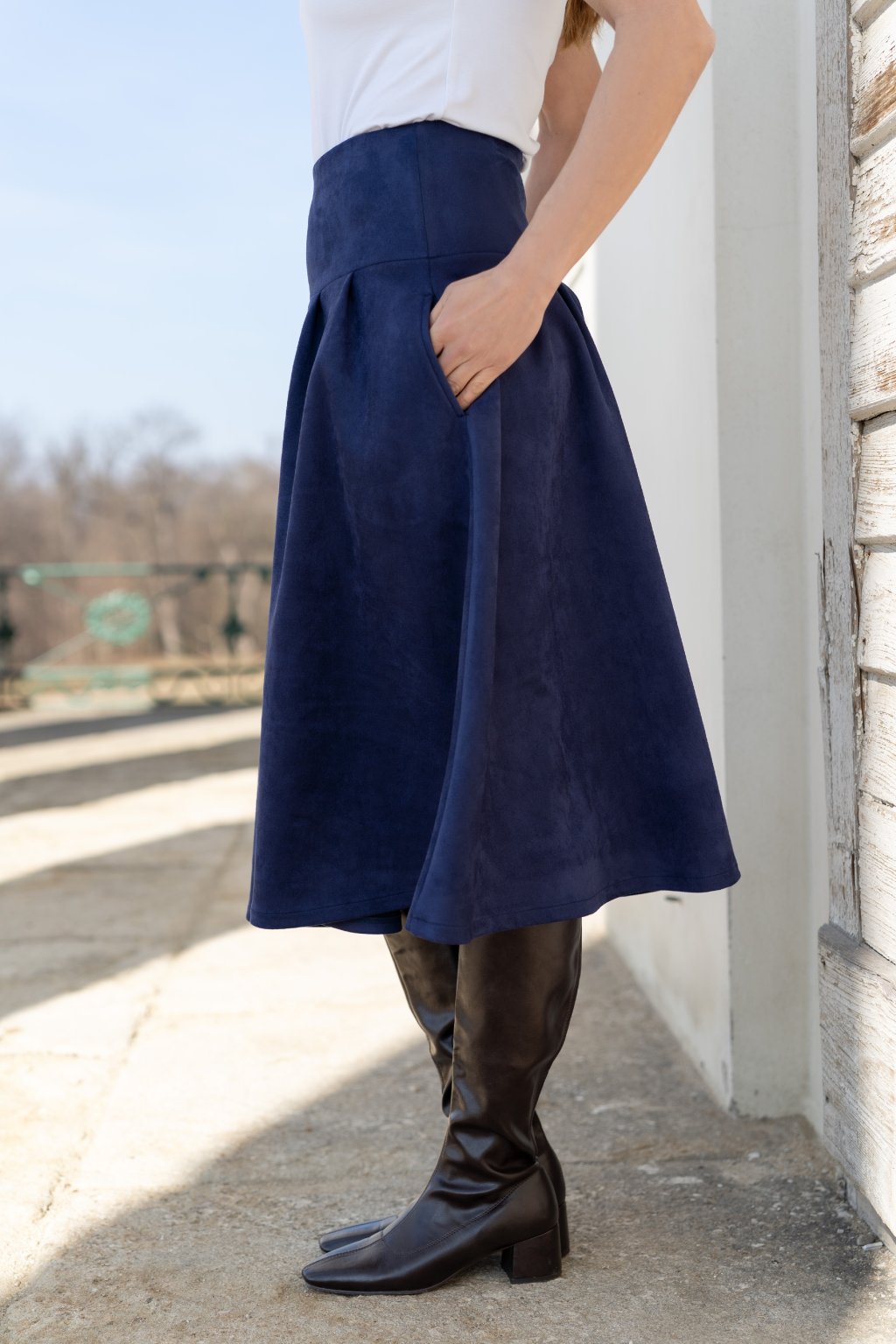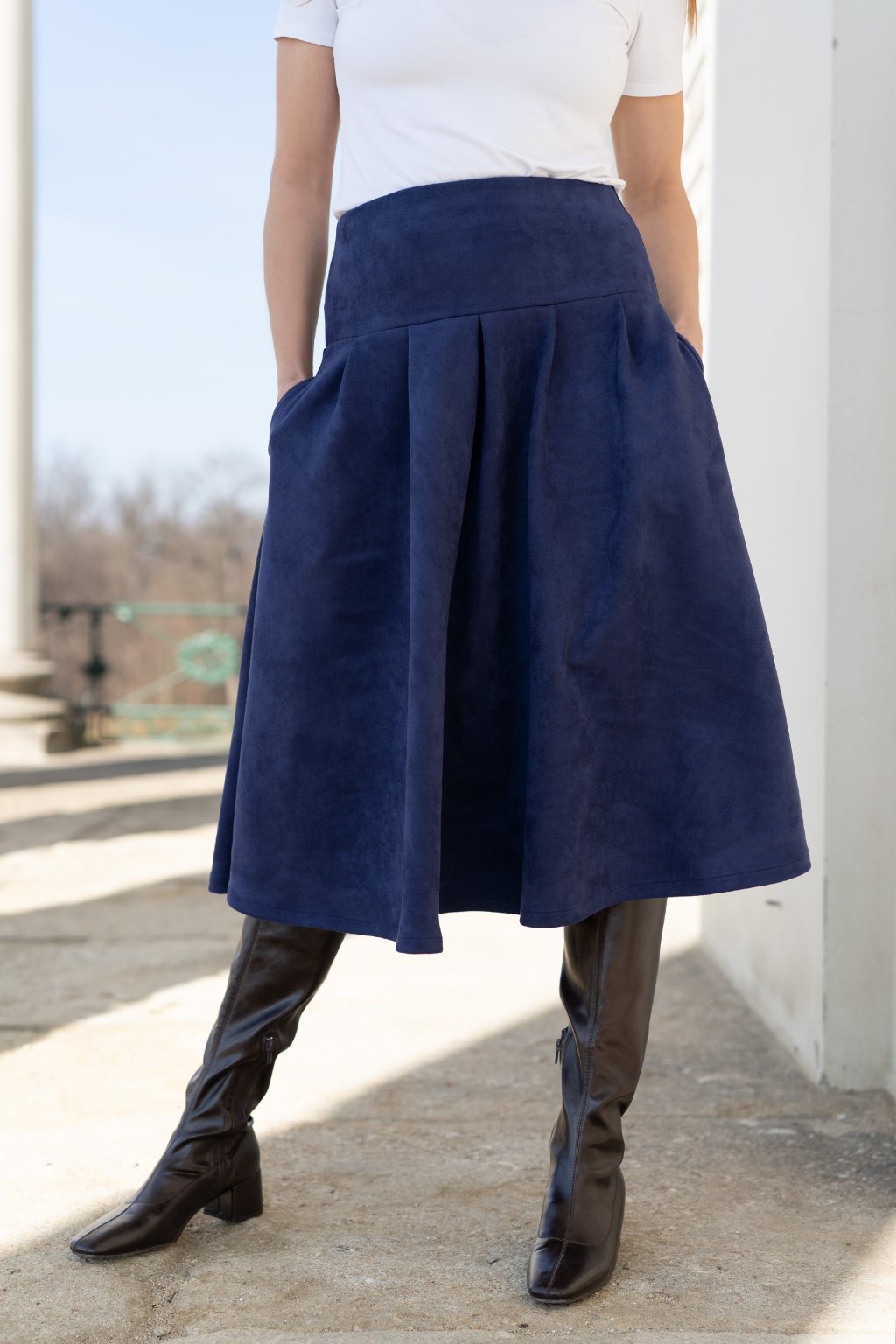 Široká sukně se sedlem a elegantními záhyby, které vytváří krásnou, ženskou siluetu. Je ušitá z pružného, jemně počesaného materiálu, který je mimořádně příjemný na dotek a zajišťuje maximální komfort při nošení po celý den.