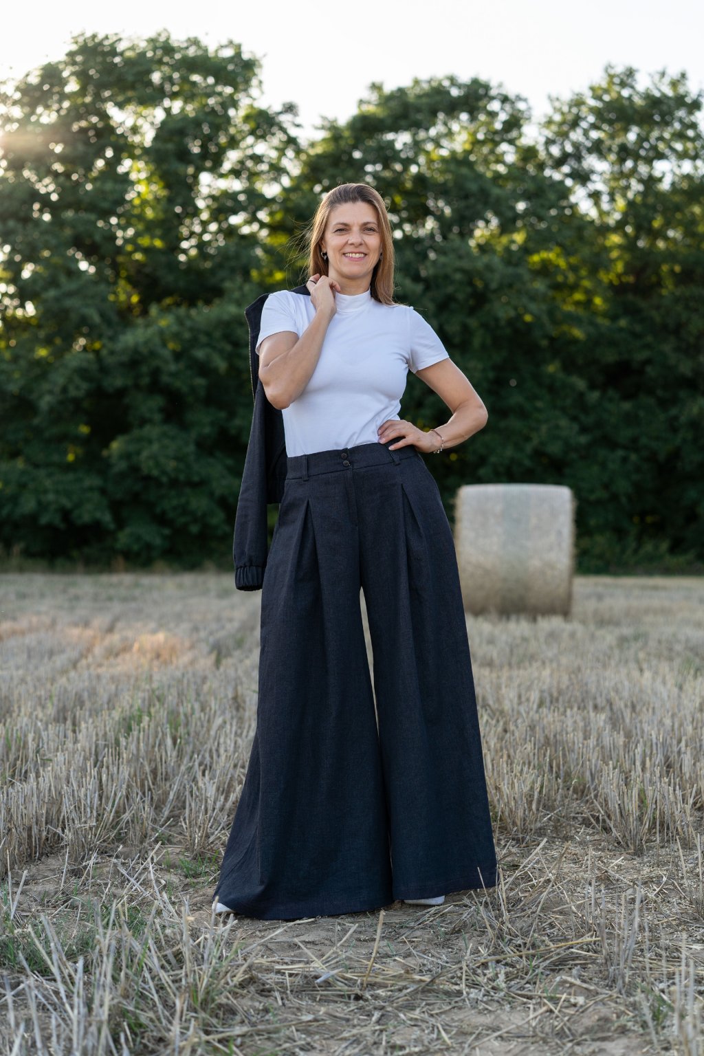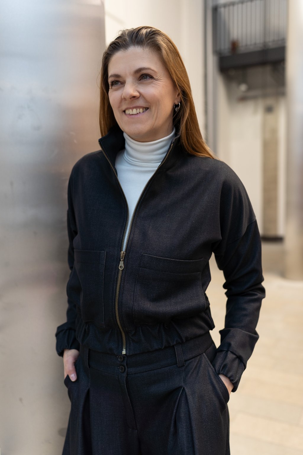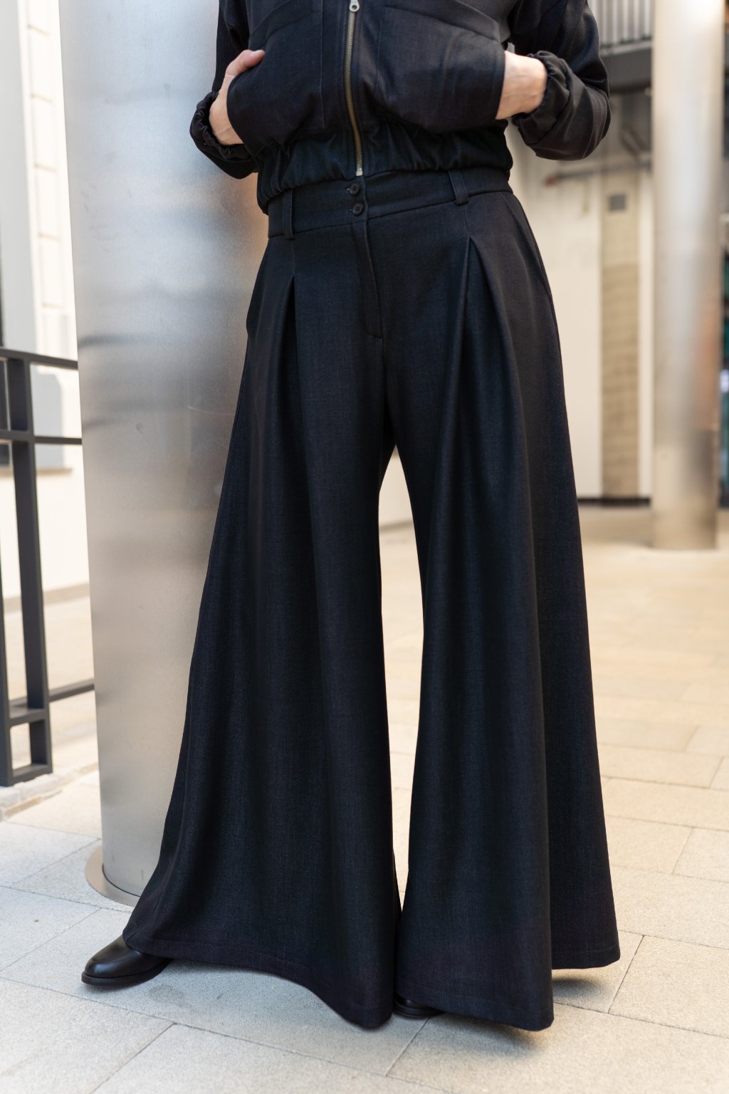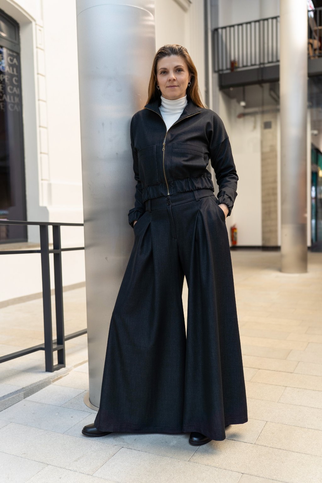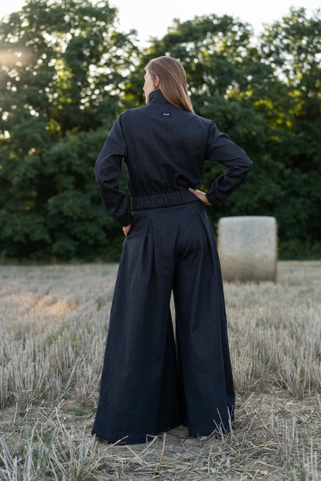Riflový komplet tvořený kalhotovou sukní se záhyby a riflovým bomberem ze stejného materiálu. Kalhotová sukně dává volnost v pohybu a působí žensky, bomber přidá ležérní, mladistvý výraz. Spolu vytvářejí pohodlný outfit do města, do práce i na volný čas, který snadno doplníte jednoduchým tričkem nebo rolákem.