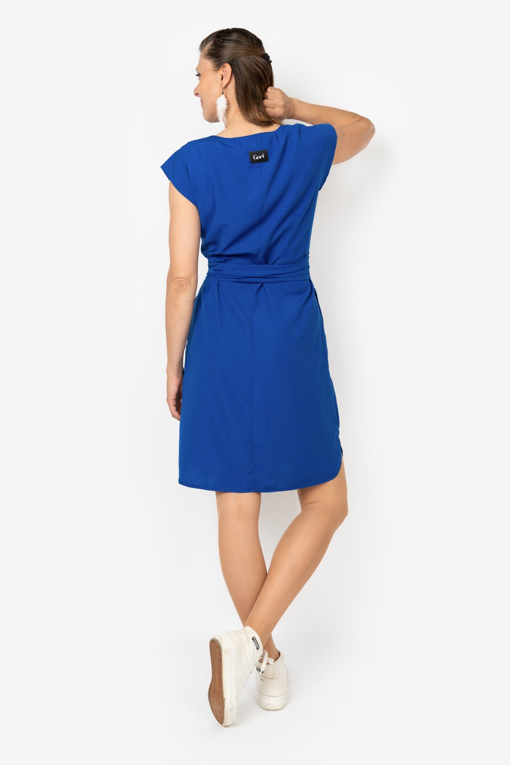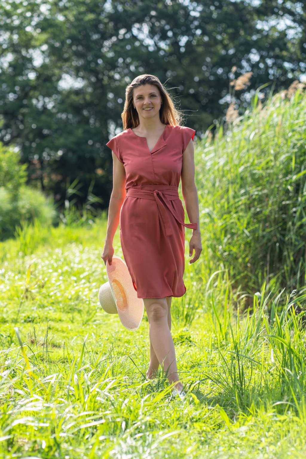 Šaty jsou vyrobeny z kvalitního polyesteru, který je lehký, odolný a snadno se udržuje. Krátký rukáv křidélkového typu, rozhalenka se skrytou légou a záhyb na předním díle dodává šatům pohyb a elegantní vzhled. Kapsy v bočních švech nabízení stylové řešení pro uložení drobností. Šaty lze nosit s páskem, který zvýrazní vaši siluetu, nebo bez pásku pro uvolněný a pohodlný vzhled. Tento lehký a vzdušný model je ideální pro různé příležitosti.