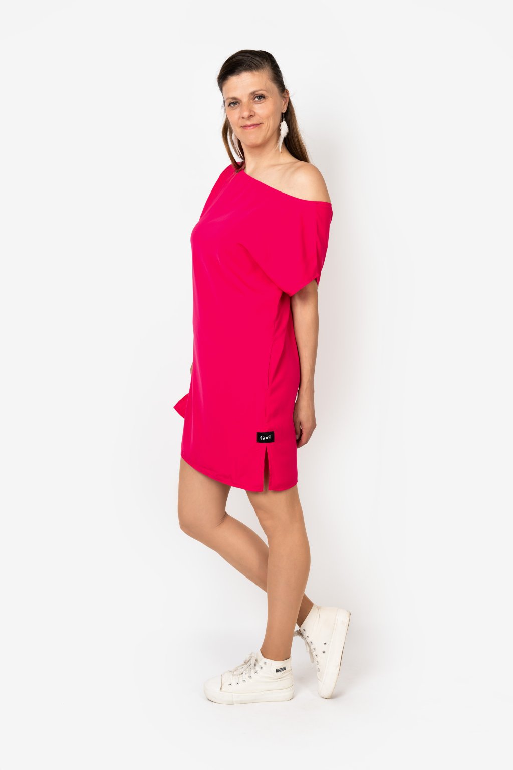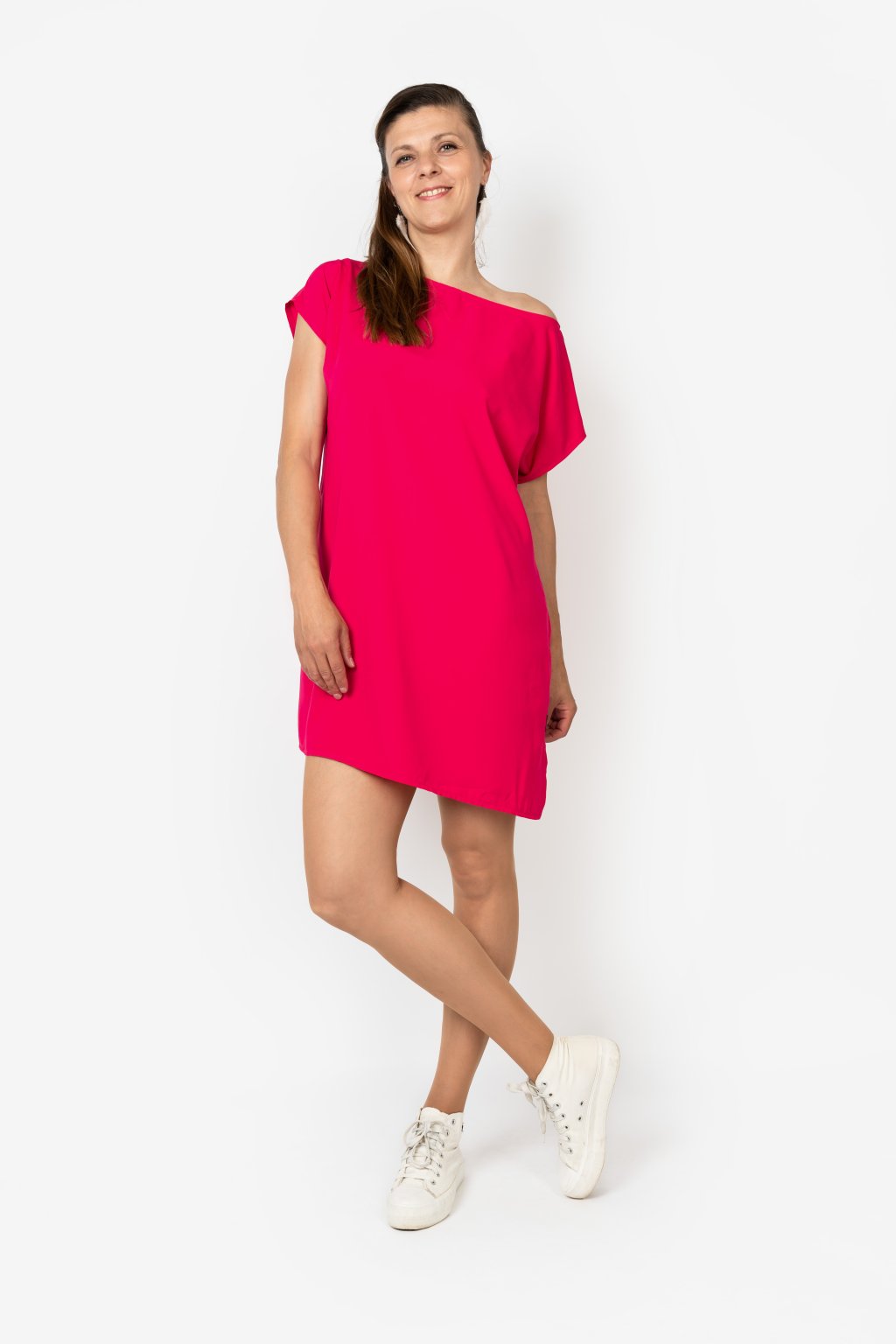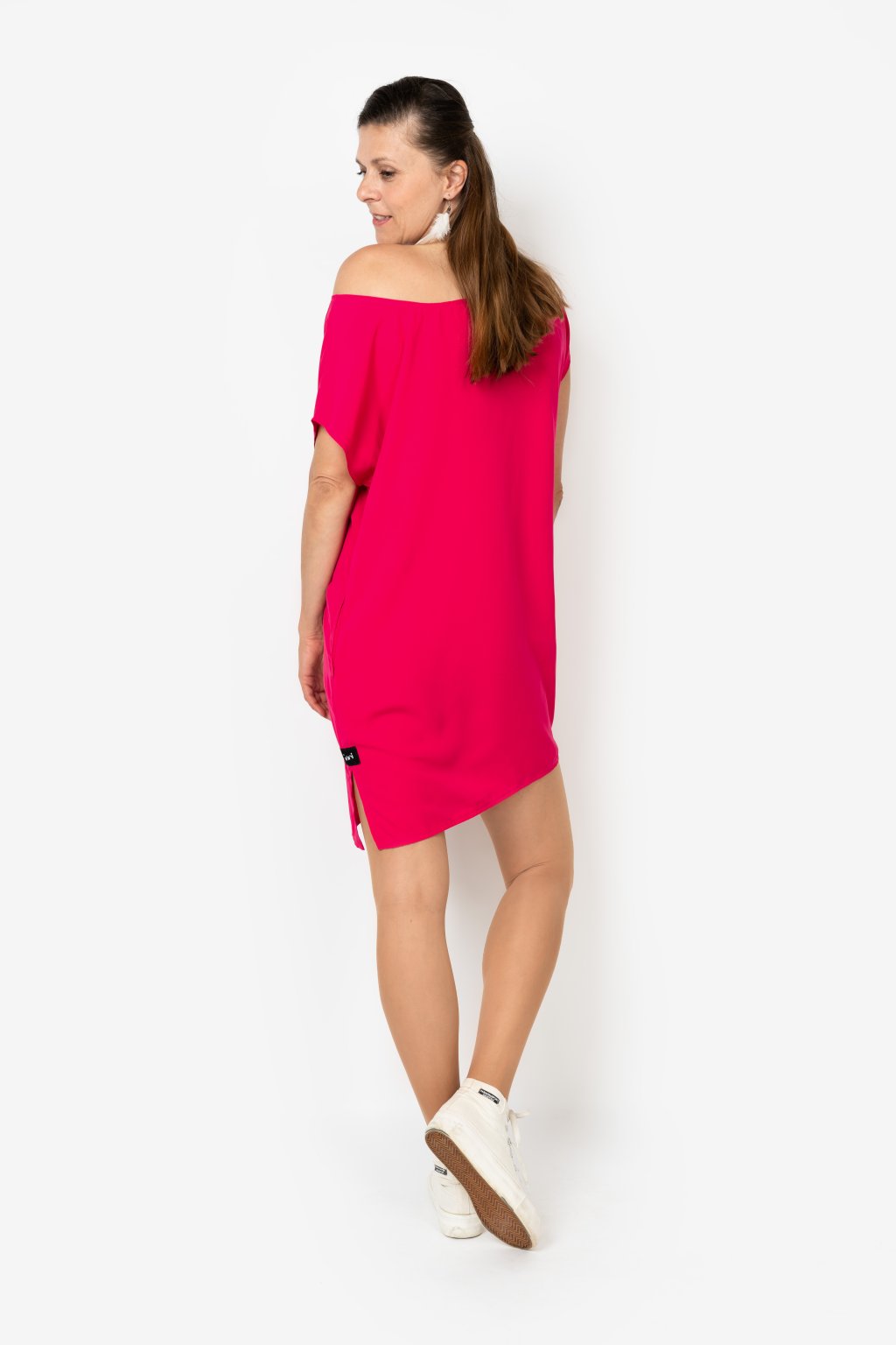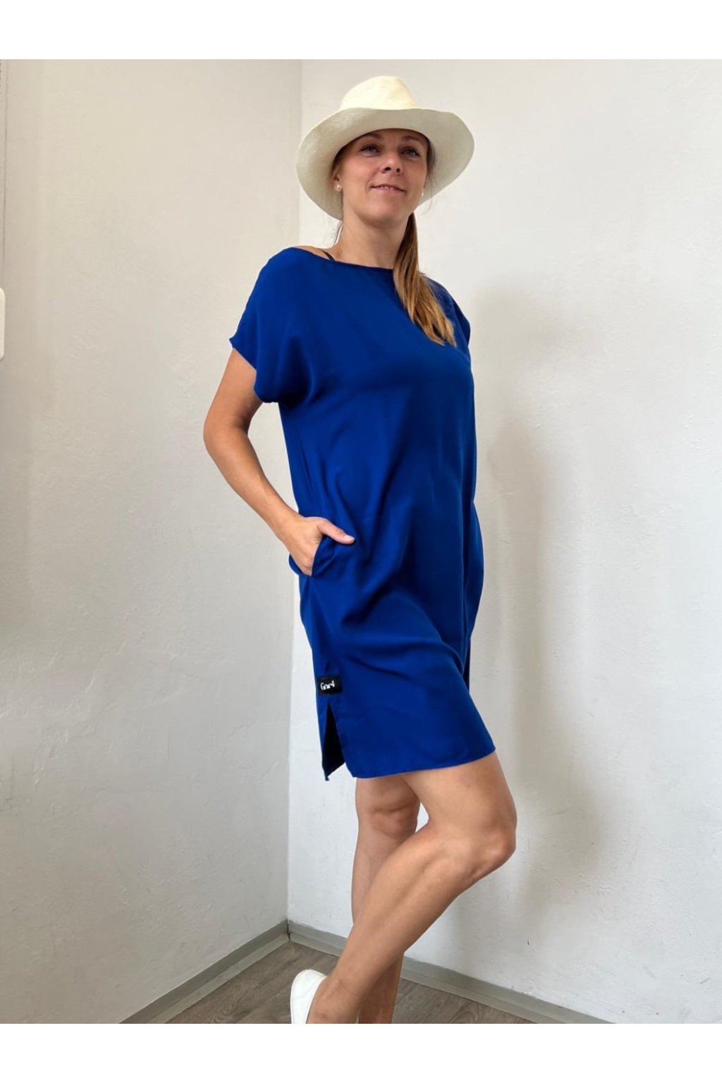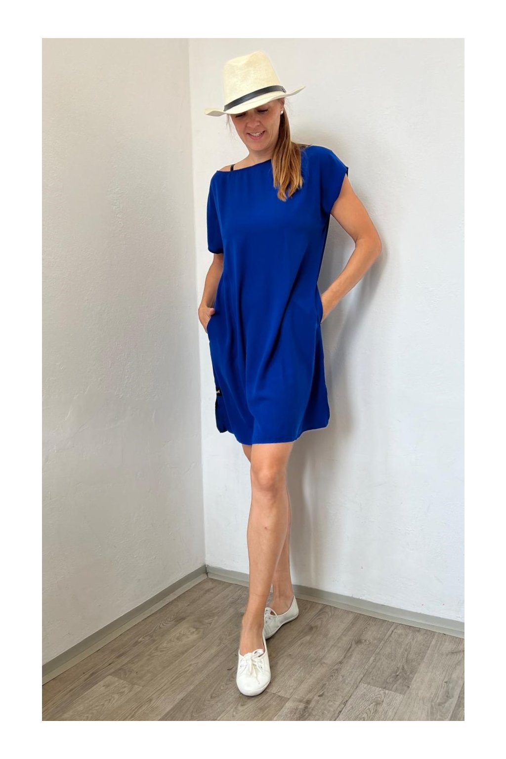 Volný střih a lodičkový výstřih dodávají šatům vzdušný a ležérní vzhled. Šaty mají spadlé rukávy, rozparky v bočních švech a kapsy ve švu, což zajišťuje pohodlí a praktičnost. Obléknete je rády v parném létě na procházku městem nebo po pláži.