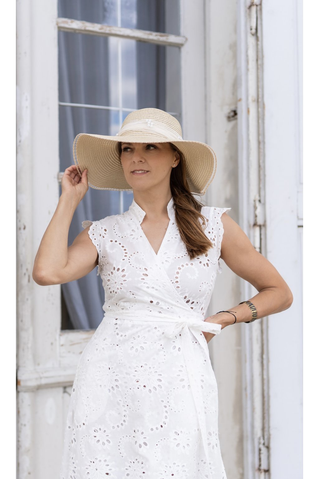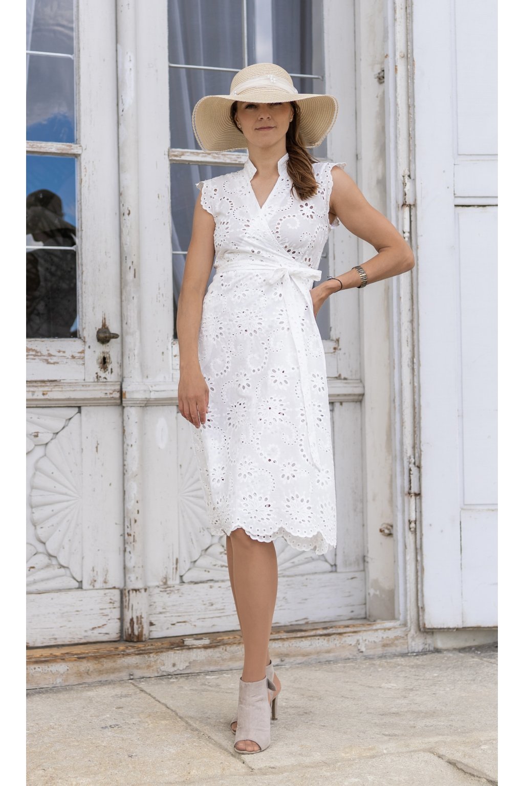 Šaty jsou ušity z bavlněné madeiry, jsou příjemně vzdušné, jejich střih podtrhne ženskost každé postavy. Šaty mají malý stojací límeček, výstřih do tvaru V a krátké rukávky. Zavinovací střih s elegantním cípem na předním díle lichotí ženské postavě. Kapsy v bočních švech přidávají šatům na praktičnosti a přináší extra pohodlí.