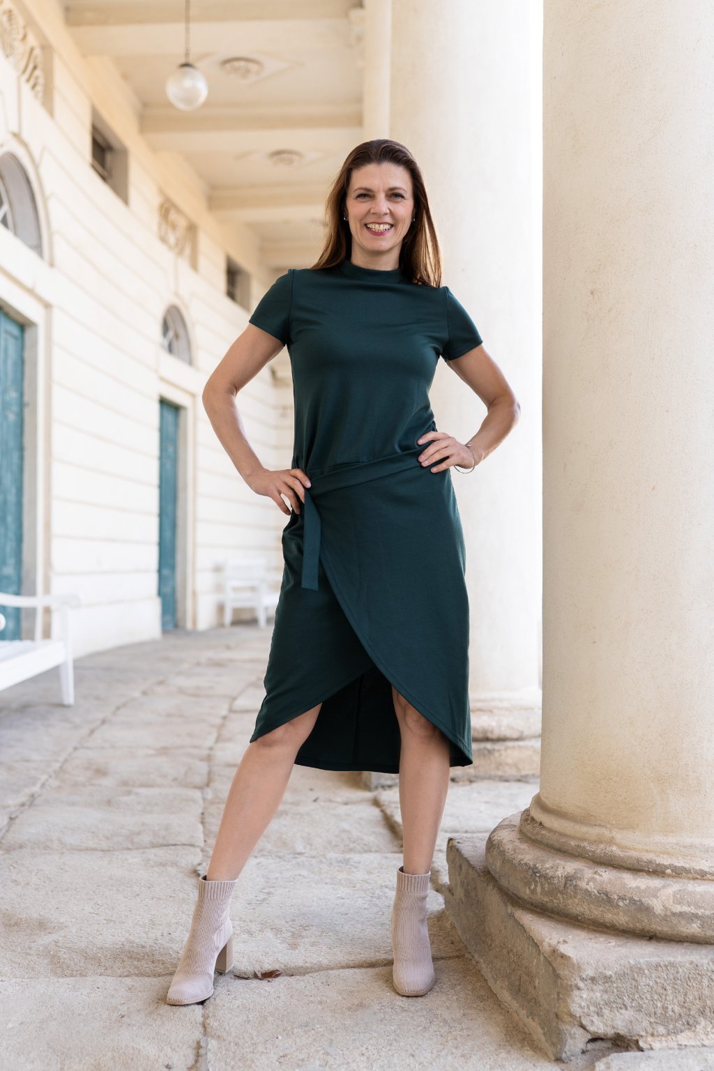 Roláček, krátký rukáv a atypické překřížení sukně se sponou na boku, dělá tyto šaty jedinečným a neotřelým kouskem. Spona na boku není jen ozdobným prvkem, ale umožňuje i přizpůsobit si šaty své postavě. Lehce navolněný horní díl vytváří krásnou siluetu a dodává modelu vzdušnost.